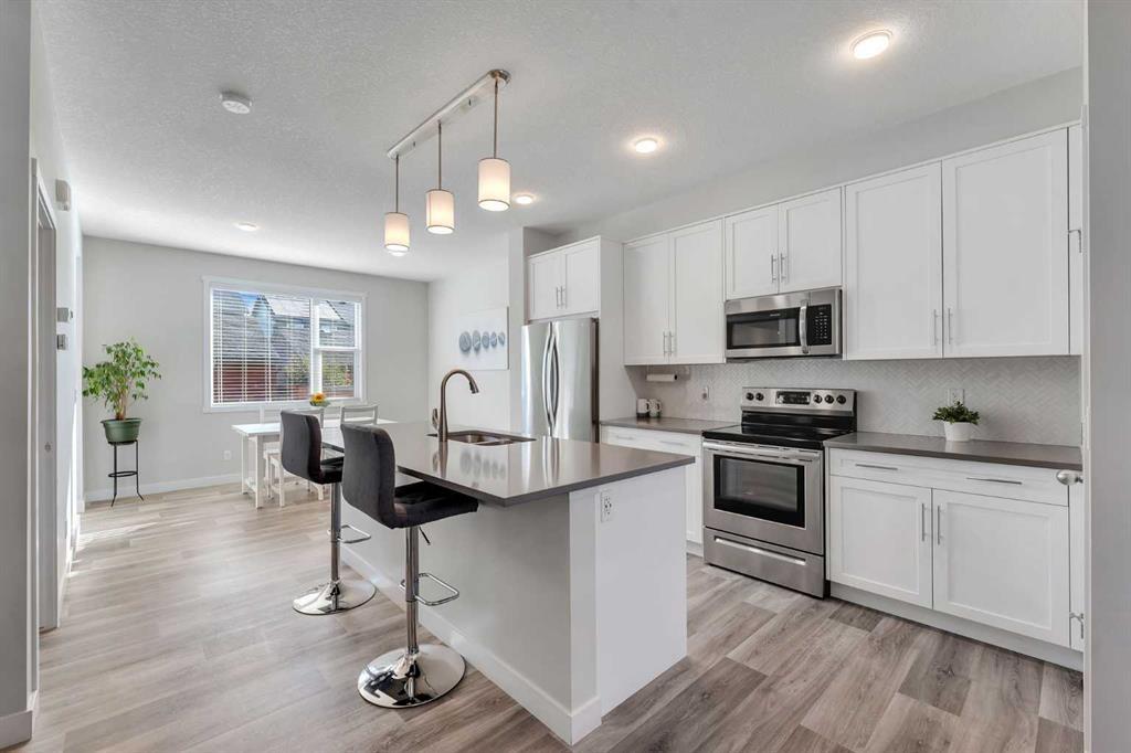 Whether you're looking to move up, downsize, or step into the market for the first time, this gorgeous duplex in the desirable community of King's Heights truly ticks all the boxes. Featuring a fully finished basement and over 2100 sq. ft. of developed living space, a beautifully landscaped private back yard, a sunny front porch, and a detached double garage, this home is move-in ready and has everything you need. As you step inside, you're greeted by a crisp, bright colour palette, beautiful laminate flooring, 9' ceilings, and an airy open floor plan. The spacious front living room flows seamlessly into the kitchen, which features ample white cabinetry, quartz countertops, sleek stainless steel appliances, and an adjacent dining area, perfect for entertaining. A convenient powder room, additional storage, and direct access to your private fenced backyard complement the main floor living space. Out back, a great deck and stamped concrete patio provide a wonderful place to relax and unwind. The addition of a poured concrete walkway to the double garage, along with a parking pad for extra parking, makes life even more convenient. Upstairs, the inviting primary suite features a walk-in closet and a private en-suite. Two additional bedrooms, a full four-piece bathroom, and the convenience of upper-floor laundry complete this level. The fully developed basement offers extra living space, featuring a recreation room, a fourth bedroom or home office, a full bathroom with heated floors, and ample storage. No need to worry about finishing it yourself, it's already done! This home has been lovingly maintained and is situated in the family-friendly community of King's Heights. You'll enjoy quick access to and from Airdrie, as well as nearby shopping, schools, parks, ponds, and scenic walking paths. It's a neighbourhood you'll be proud to call home.